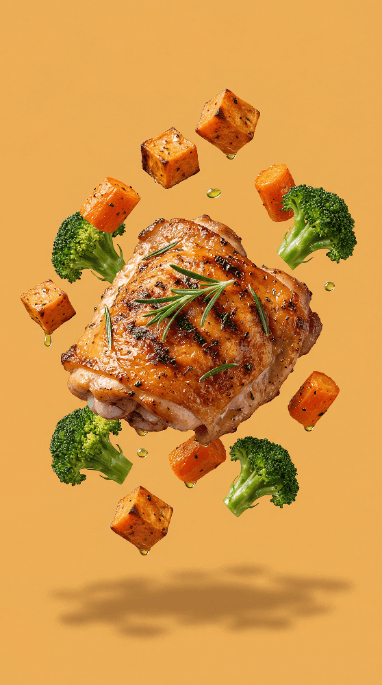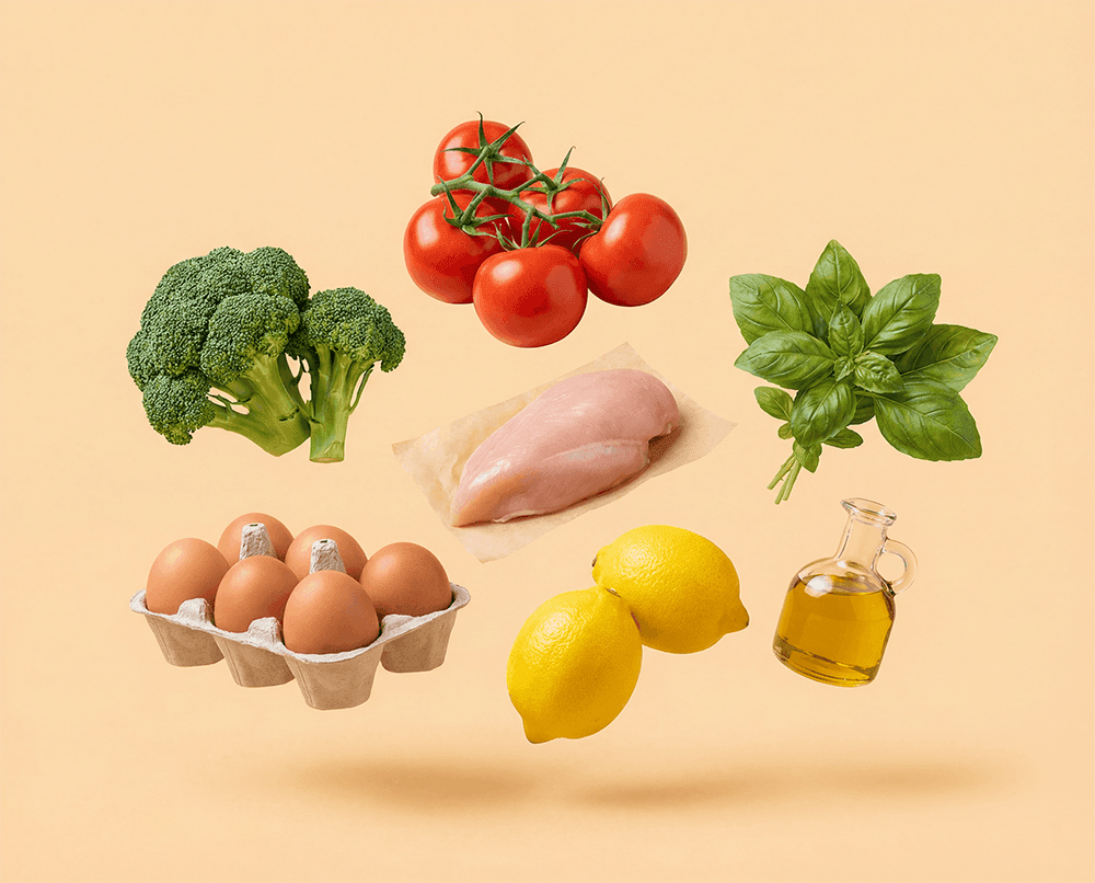 Massas, arroz, frango, carne, peixe, ovos.